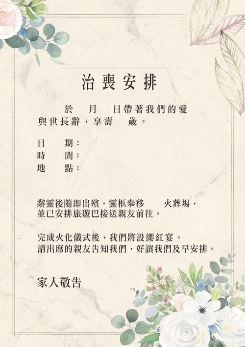 中式和西式訃聞在格式和內容上存在著明顯的差異。中式訃聞講究整齊肅穆,注重家族的傳承和感謝,而西式訃聞則側重事實陳述和對故人的回憶。在編寫訃聞時,應該根據文化背景和傳統習俗,遵循適當的格式和內容要求,以表達對逝者的敬意和哀悼之情。無論是中式還是西式訃聞,都是人們表達對故人的最後告別和懷念,彰顯了生命的尊嚴和無盡的思念。